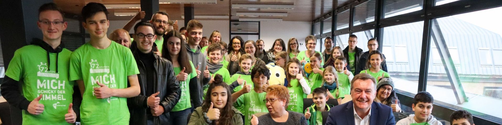 Anschließend wurden dem Oberbürgermeister noch kleine Präsente übergeben und gemeinsam das 72-Stunden-Aktions-Lied gesungen, mit Unterstützung an der Gitarre durch Paul Kowalski und Maurice Radauscher. Wir danken allen Ehrenamtlichen und Beteiligten, dass eine so tolle und bunte Aktion erneut gelingen konnte.