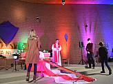 Ein kleines Redaktionsteam hatte im Vorfeld ein abwechslungsreiches Vorprogramm zusammengestellt. Im „antons - meat and eat“ hatte sich das Team mit viel Technik auf seine Gäste vorbereitet und verschiedene Beiträge aufgenommen unter anderem die Katechese von Bischof Michael Gerber zum Motto der Veranstaltung „Steh auf!“ und zwei Zeugnisse junger Menschen darüber, wie ihr Glaube ihr Leben prägt. Dieses Vorprogramm konnten die Teilnehmenden zu Hause am Bildschirm und in St. Lukas auf der Leinwand verfolgen. Im YouTube-Chat gab es die Möglichkeit, Fragen einzusenden, die der Bischof anschließend beantwortete.