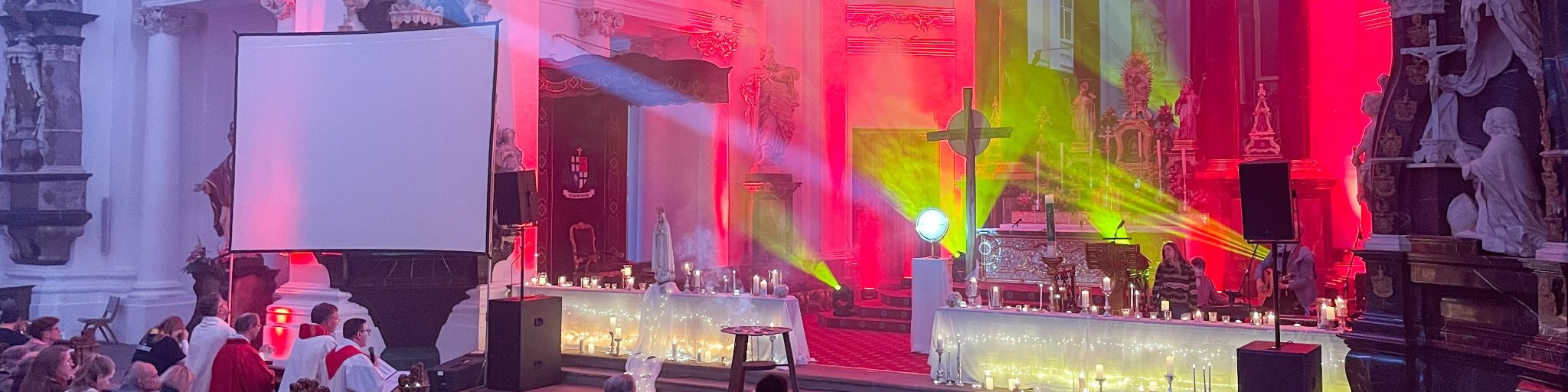 Am Samstagabend feierten rund 500 Christen im Dom einen Abend der Barmherzigkeit. Durch die gelungene Zusammenarbeit der Abteilung Jugend und Junge Erwachsene und dem Verein poiema e. V. aus Hilders gelang ein unvergesslicher Abend bei dem Christinnen und Christen unterschiedlicher Generationen die Einstimmung auf das Pfingstfest einläuten könnten. Eine aufwendige Lichtinstallation, moderne Lobpreismusik der Band LOBEN unter der Leitung von Daniel Harter und eine ansprechende Dekoration des Doms durch das Dekoteam des poiema e.V. begleiteten den Abend und führten die Gläubigen in eine spirituelle Gebetszeit.