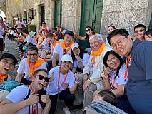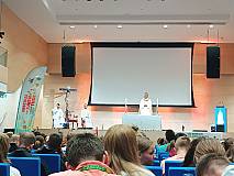 Am heutigen Mittwochmorgen, 02.08.2023 um 9:30 Uhr haben sich das Bistum Fulda mit den Pilgerinnen und Pilgern aus deutschen Bistümern und einem aus Österreich in einem Audienzgebäude in der Nähe unserer Unterkunft getroffen. Diese umfasst Sitzplätze für 600 Menschen, sodass jeder einen Platz im klimatisierten Sitzungsraum erhalten hat. Musikalisch umrahmt wurde die Katechese von einer Band aus Trier, die mit ihren passend ausgewählten Liedern uns Teilnehmenden in die richtige Stimmung versetzen und eine schöne Atmosphäre für die nächsten zwei Stunden erzeugt hat.