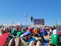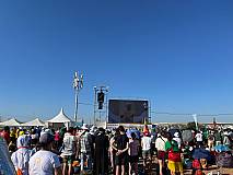 Nach dem Aufstehen sind viele zu einem Gottesdienst gegangen, den unser Bischof Michael Gerber gehalten hat. Danach ging es weiter zum Frühstück, nach dem wir uns individuell, die einen früher, die anderen später, auf den Weg zum Abschlussgelände gemacht haben. Dort angekommen haben viele sich von dem anstrengenden Weg versucht vor der heißen Sonne zu verstecken, in dem sie sich beispielsweise Sonnenschilder aus Rettungsdecken aufspannten, worunter man sich dann endlich ein Mal ausruhen konnte. So vertrieben wir uns Zeit mit Schlafen, Spielen und dem Essen, das wir auf dem Weg bekommen haben. Auch konnten wir den Weg des WJT-Kreuzes und des Marienbildes sowie daraufhin die Ankunft des Papstes auf einem großen Bildschirm verfolgen. Dann begann die Vigil, die durch Begrüßungen, Tanz und eine schöne Lichtershow eingeleitet wurde, bis Papst Franziskus seine Ansprache begann, in der er merklich mit den Jugendlichen interagierte. Daraufhin wurde das Allerheiligste ausgesetzt.