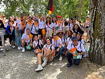 So ging es für uns nach dem Frühstück in einen größeren Ort namens Papa Quintela. Dort trafen wir uns mit allen jungen WJT-Pilgernden aus der ganzen Welt, die in unserem Gastbistum Lamego die Tage der Begegnung verbringen – von Amerika über Frankreich bis hin zur Ukraine! Das dortige Diözesantreffen war eine Art Festival: Mit so vielen Menschen in so einer tollen Partystimmung mit portugiesischer und christlicher Musik vereint zu sein, das kann man nicht beschreiben! Auf jeden Fall hat es uns einen, wenn auch nur geringen, Vorgeschmack auf Lissabon nächste Woche gegeben. Dem gemeinsamen Mittagspicknick auf einer großen Wiese folgte unsere Weiterfahrt nach Lamego. Hier war vor allem eine wunderschöne Marien-Wallfahrts-Kirche auf einem Hügel mit einem gewaltigen Treppenaufgang zu bestaunen. Mit allen Nationen, die unter den Pilgernden in Lamego vertreten sind, haben wir noch eine gemeinsame Messe mit dem Bischof von dort gefeiert.
